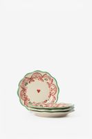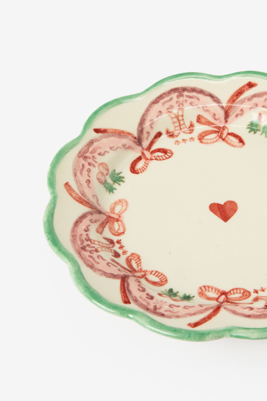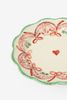Multicolour ontbijtbord met strikjes van Sissy-Boy. Het witte ontbijtbord is versierd met een roze strikjespatroon en een hartje in het midden. Afmeting: 20 cm. Materiaal: 100% steen.