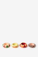 Set van 4 multicolour servetringen met print van Sissy-Boy. Deze kleurrijke servetringen zijn handbeschilderd en hebben verschillende speelse prints met leopard, vissen en ruitpatronen. Afmetingen: 6,2 x 6,2 x 8 cm. Materiaal: 100% hout.
