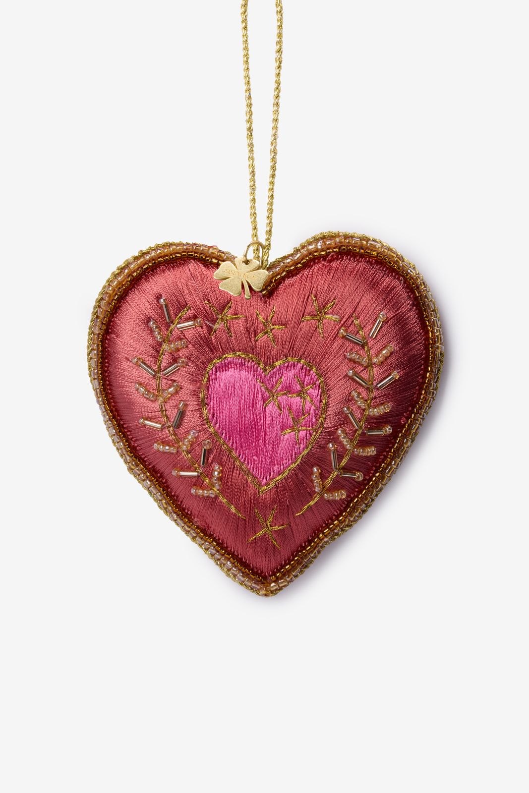 Rode kersthanger met hart van Sissy-Boy. De hanger heeft een rode kleur en is in de vorm van een hart. Verder heeft de hanger nog een hart detail in het midden en is het versierd met kralen. Afmeting: 10 cm. Materiaal: 70% glas, 30% polyester.