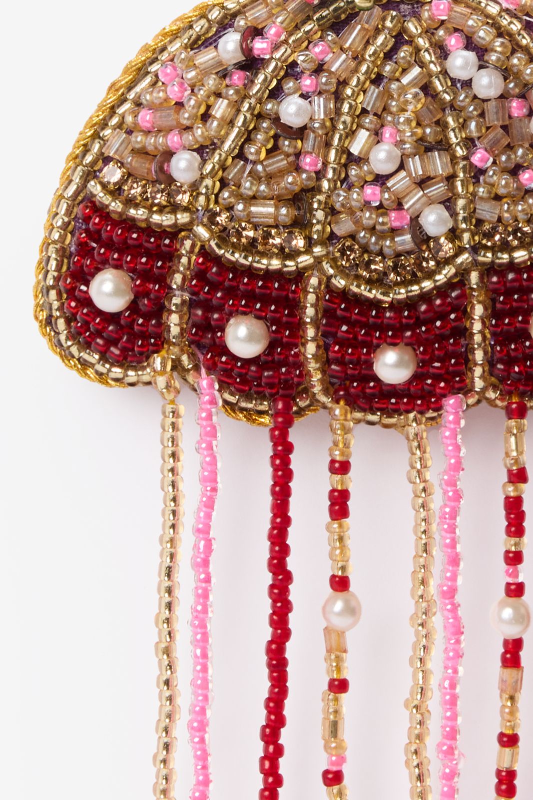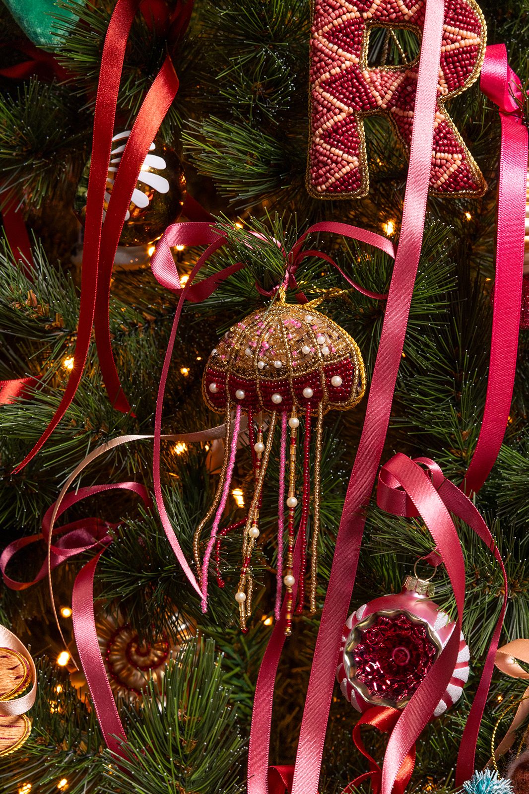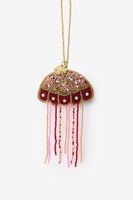 Rode kersthanger met kwal van Sissy-Boy. De hanger heeft een rode kleur met roze en gouden details. Afmeting: 13 cm. Materiaal: 60% polyol, 22% katoen, 10% lurex, 8% glas.