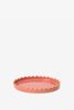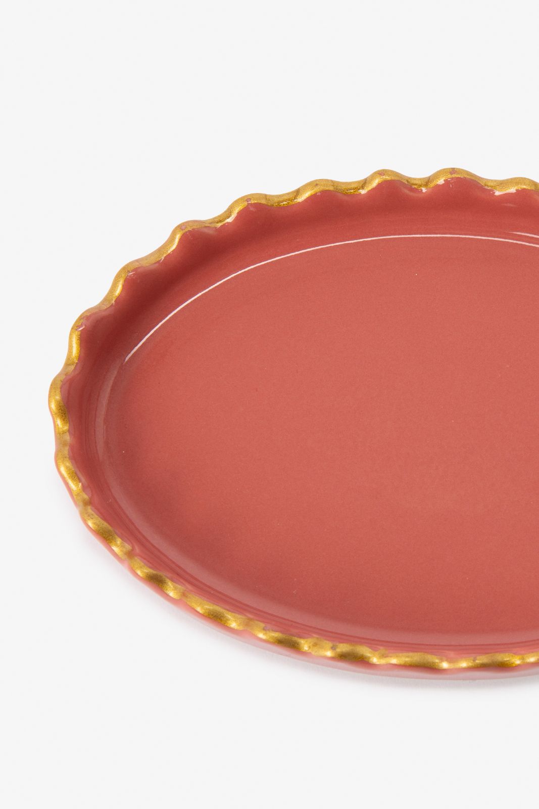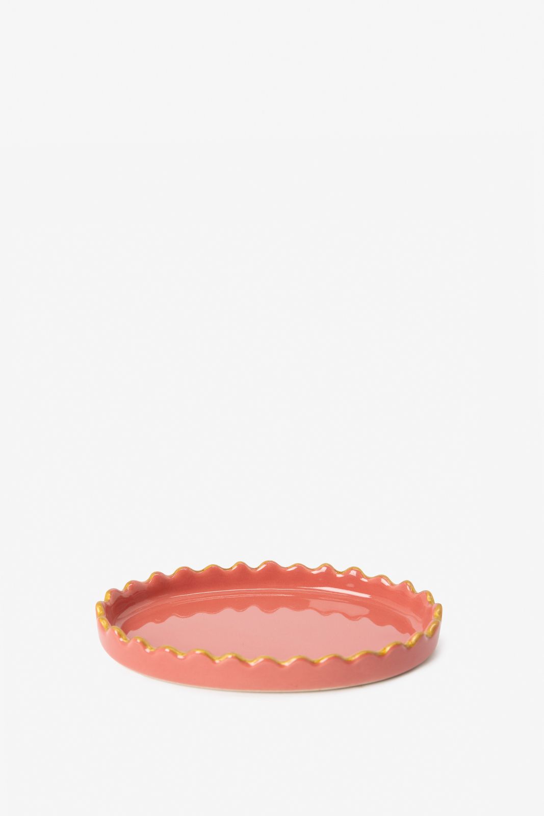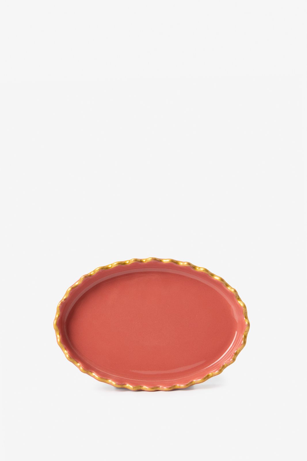 Rood ruffled schaaltje van Sissy-Boy. Het schaaltje heeft een ovale vorm en een goudkleurige ruffle rand aan de bovenzijde. Afmetingen: 13,5 cm x 9 cm x 2 cm. Materiaal: 100% keramiek.