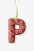Roze kersthanger van Sissy-Boy in de vorm van het initiaal P. De letter kersthanger is versierd met glazen kraaltjes op de voorkant en afgewerkt met een satijn look aan de achterkant. Materiaal: 100% polyester.
