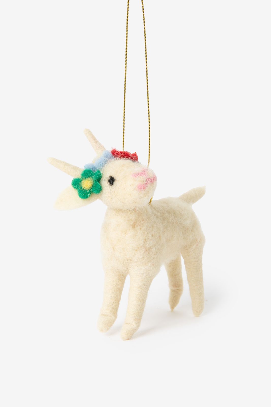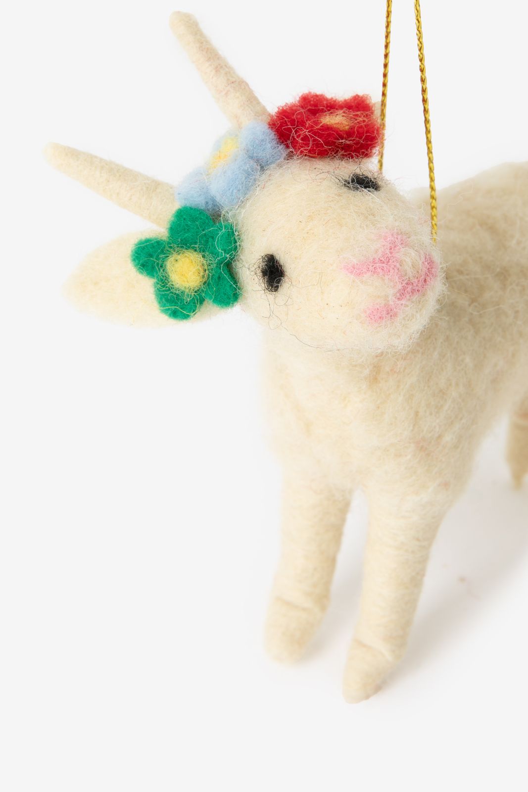 Wit vilten geit paasornament van Sissy-Boy. Het ornament heeft de vorm van een geit met bloemendetails. Afmeting: 10 cm. Materiaal: 70% polyester, 30% wol.