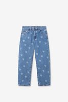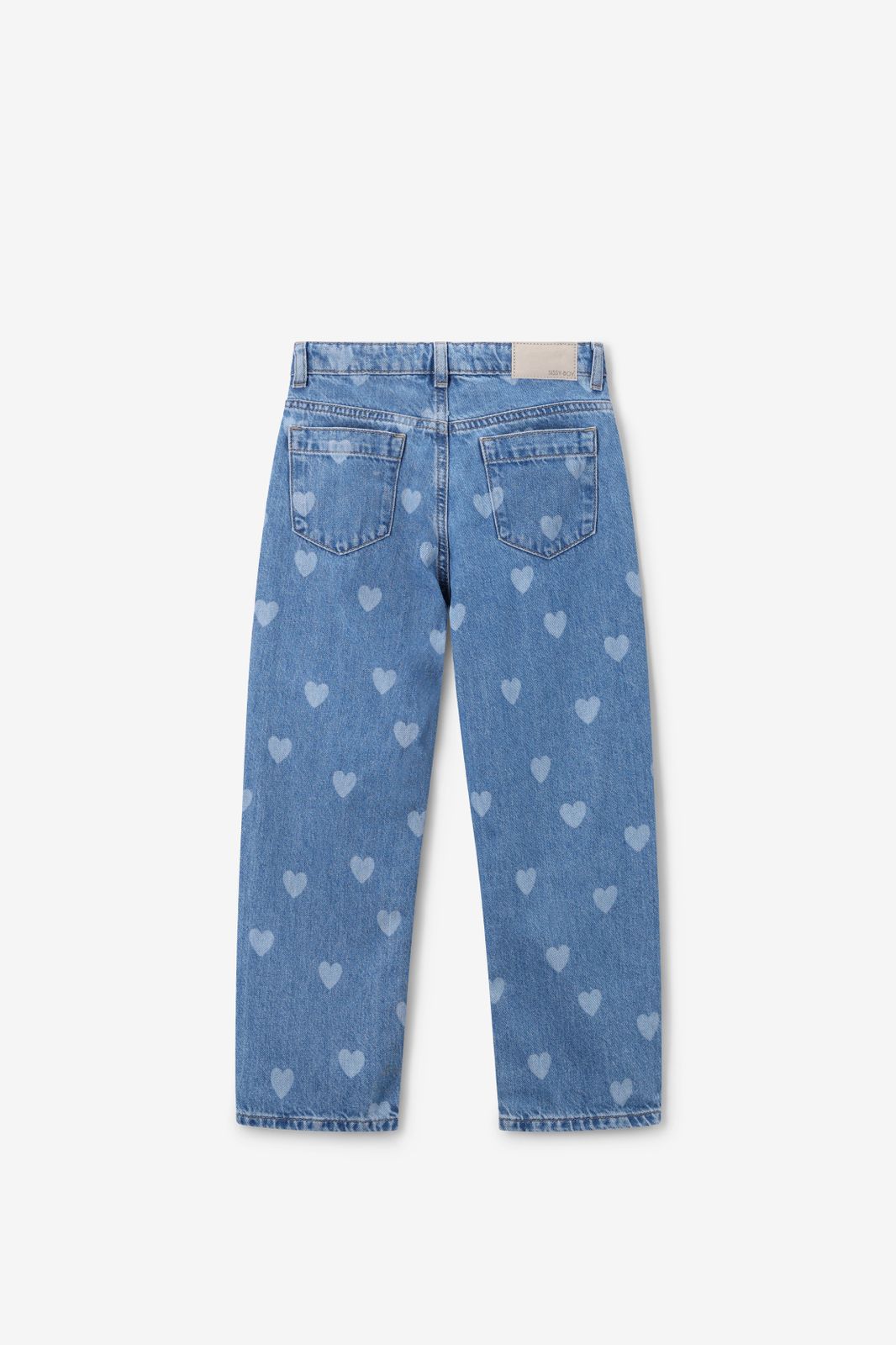 Blauwe straight leg jeans met gebleekte hartjes van Sissy-Boy. De jeans heeft een high waist, een 5-pocket model, een rechte fit en een knoop-en ritssluiting. Verder heeft de jeans een denim kwaliteit met een all-over bleached hartjes patroon. Materiaal: 100% katoen.