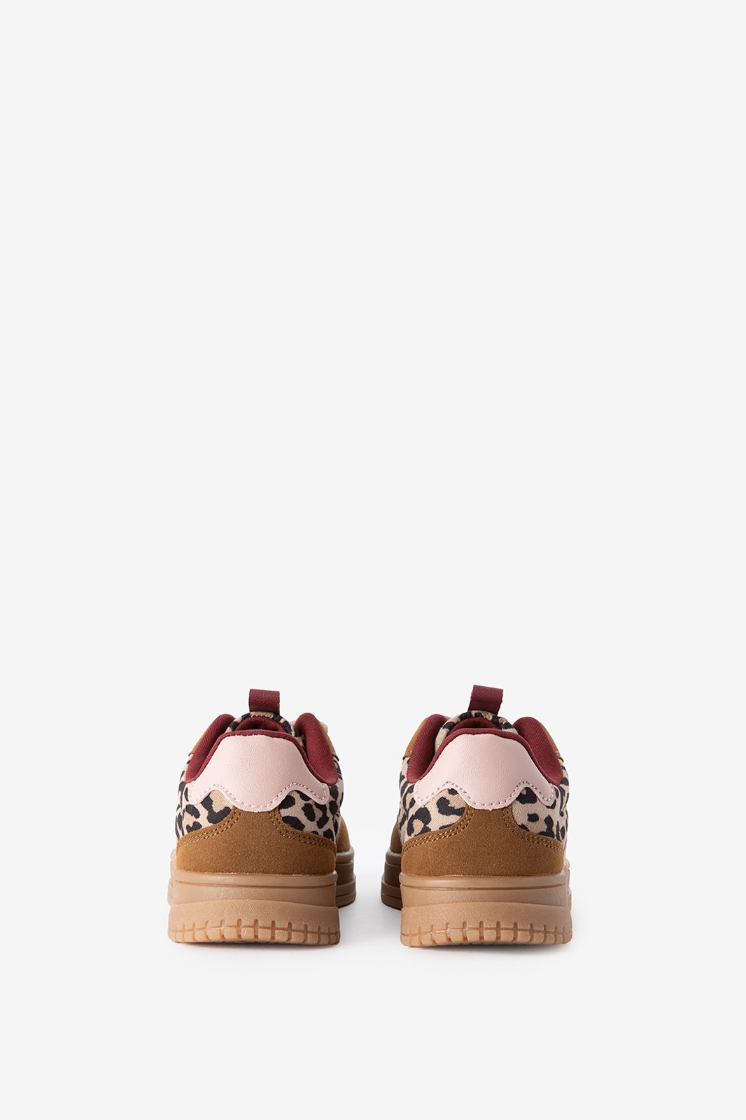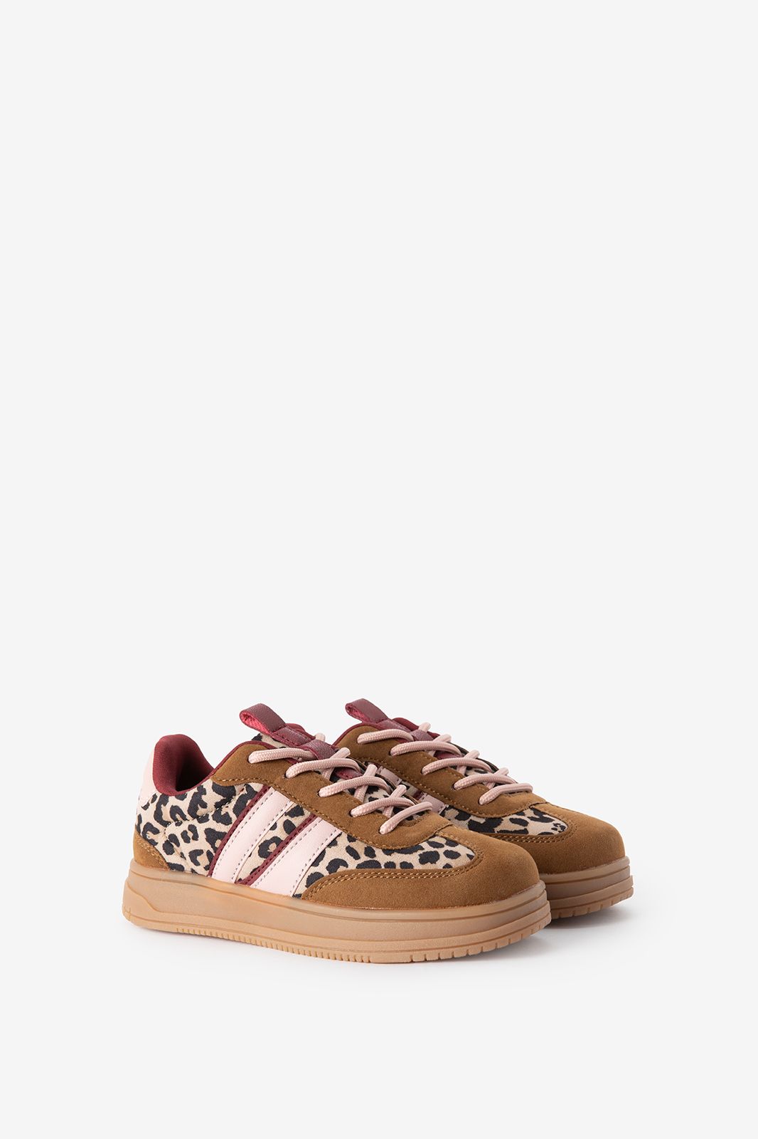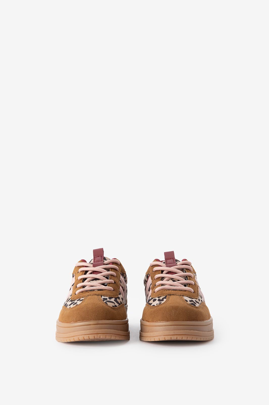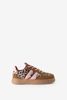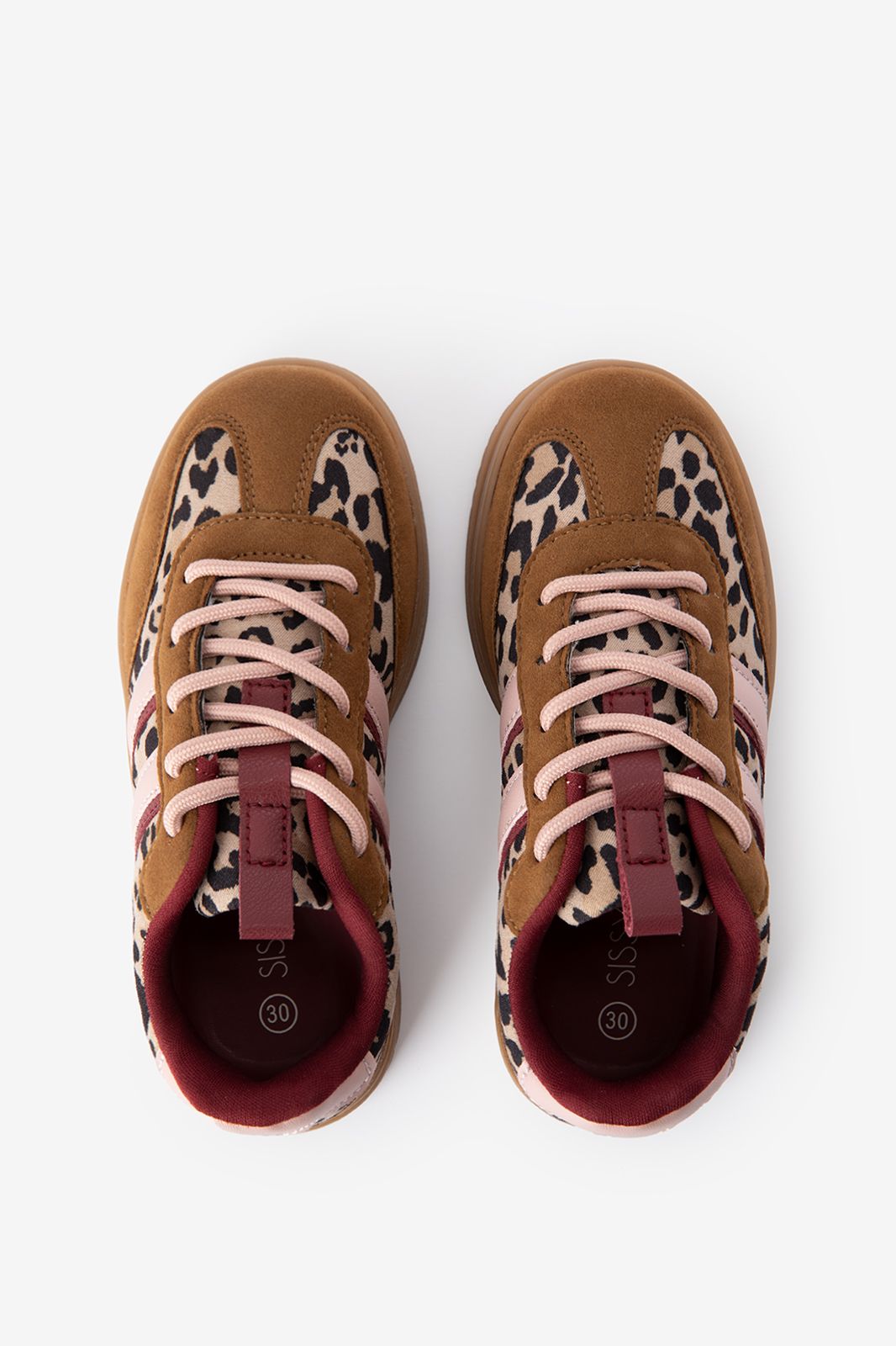 Bruine leopard sneakers met strepen van Sissy-Boy. Deze sneakers hebben verschillende tinten bruin met accenten van roze en leopard print. De schoenen zijn voorzien van een sportieve zool met een hoog profiel en snelveters voor extra gemak. Materiaal: 100% polyurethaan.