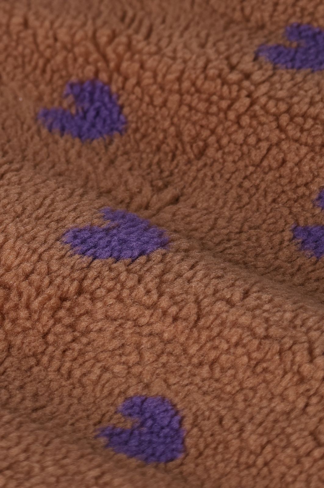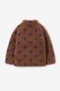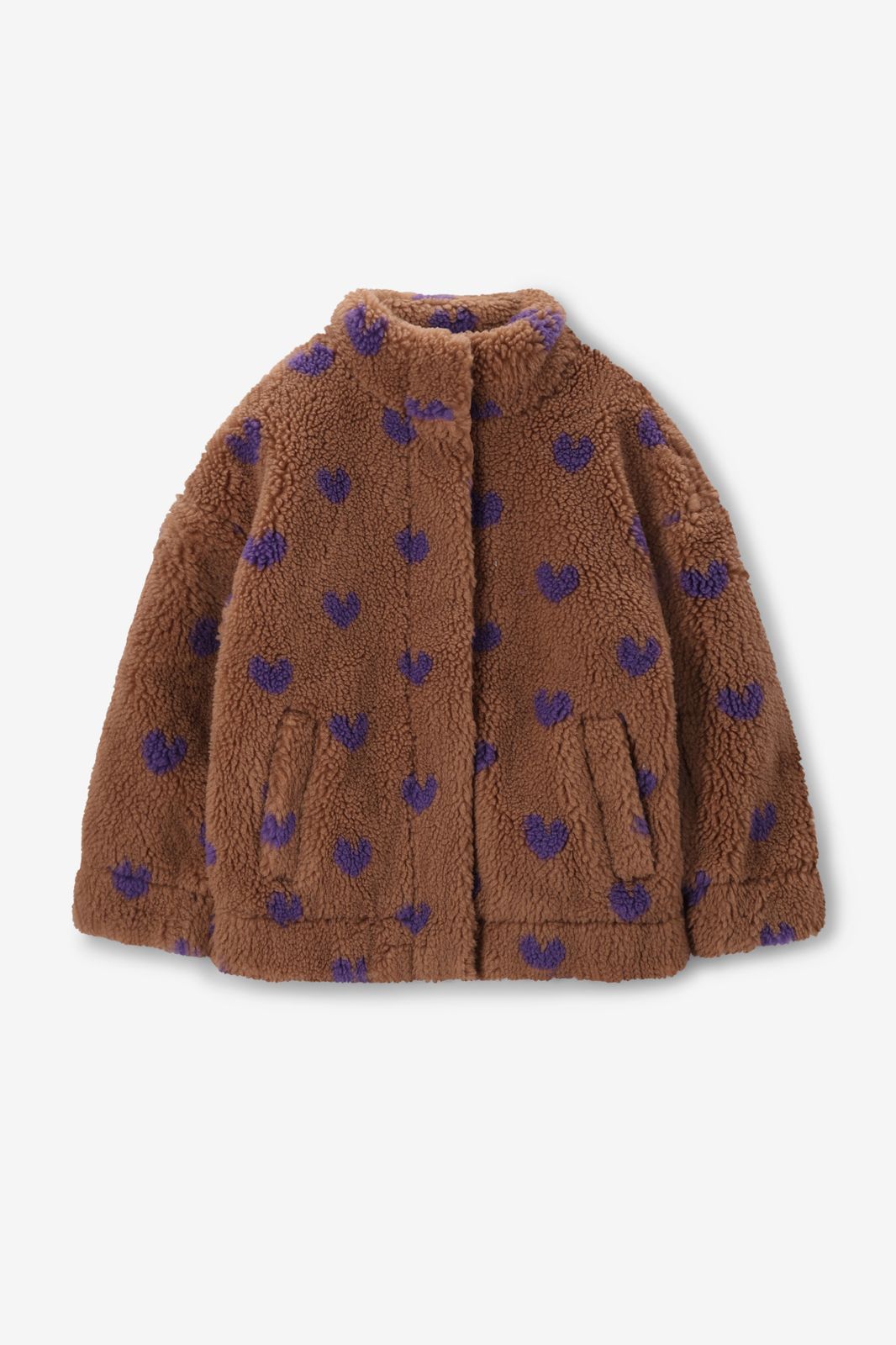Bruine teddy jas met hartjes van Sissy-Boy. De jas heeft lange mouwen, opstaande kraag, steekzakken, een ritssluiting, drukknoopsluiting en een relaxed fit. Verder heeft de jas een teddy stofkwaliteit met een all-over paarse hartjes print. Materiaal: 100% polyester.