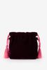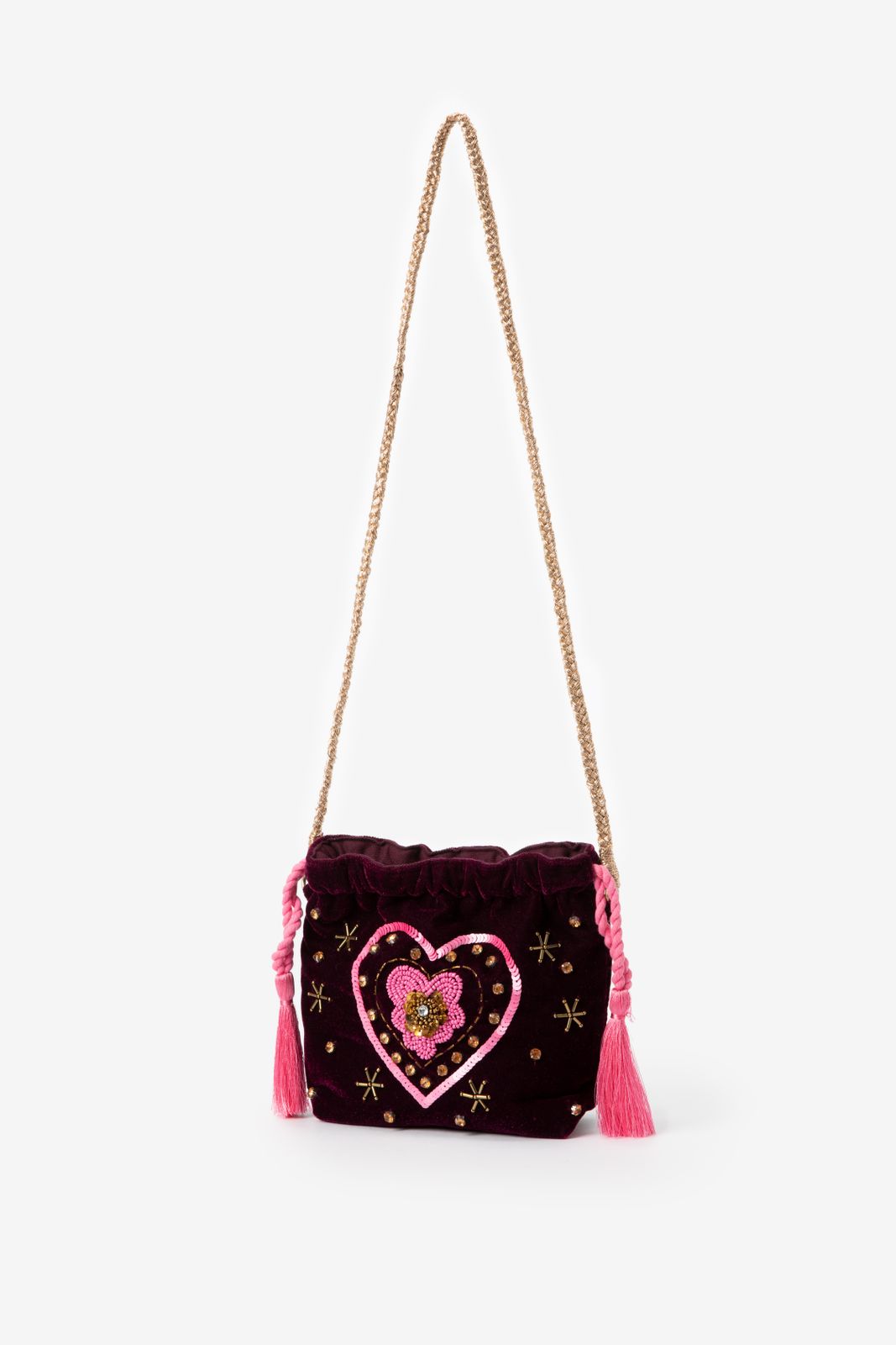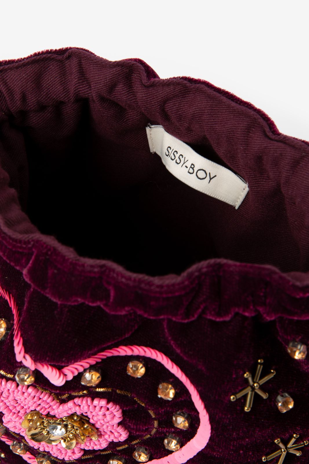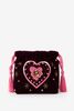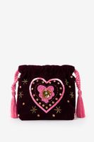 Donkerrode tas met glitter hart van Sissy-Boy. De tas heeft een donkerrode kleur, groot binnenvak en een afneembare strap. Verder is de tas gemaakt met een velvet kwaliteit stof en zitten er aan de voorzijde diverse roze en gouden pailletten en kralen. Afmetingen: 16,5 cm x 21 cm x 7 cm. Lengte strap: 98 cm Materiaal: 100% katoen.