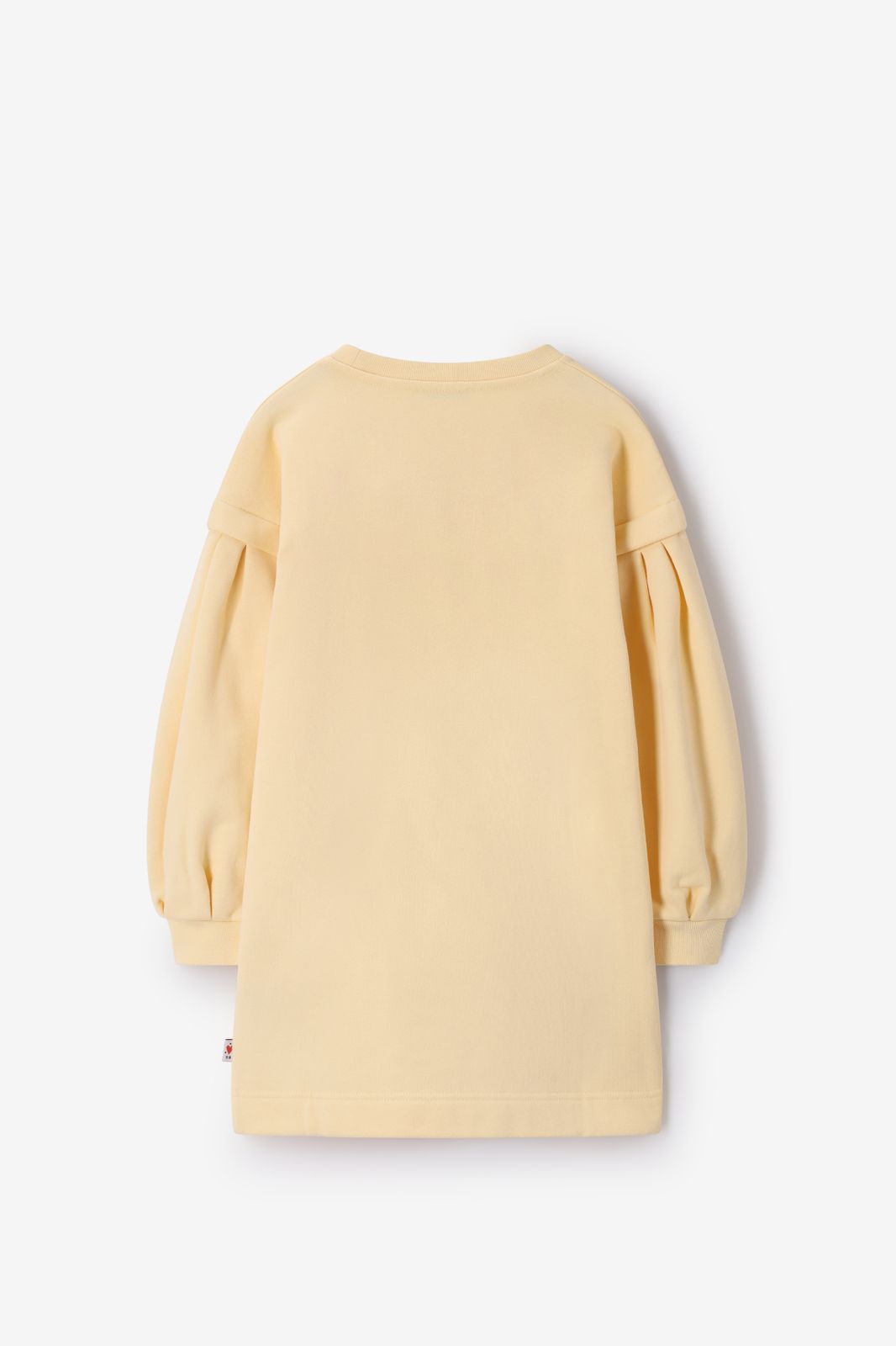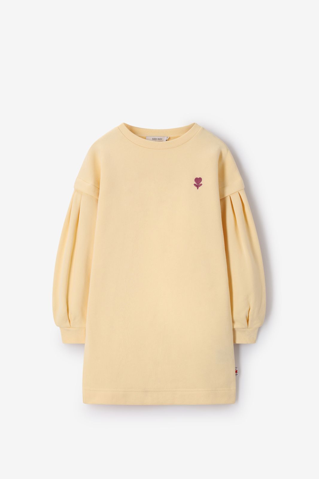 Gele sweatjurk van Sissy-Boy. De jurk heeft lange pofmouwen, een ronde halslijn, een korte lengte, verlaagde schouders en een oversized fit. Verder heeft de jurk een gele kleur met een subtiel roze detail aan de voorzijde. Materiaal: 100% katoen.