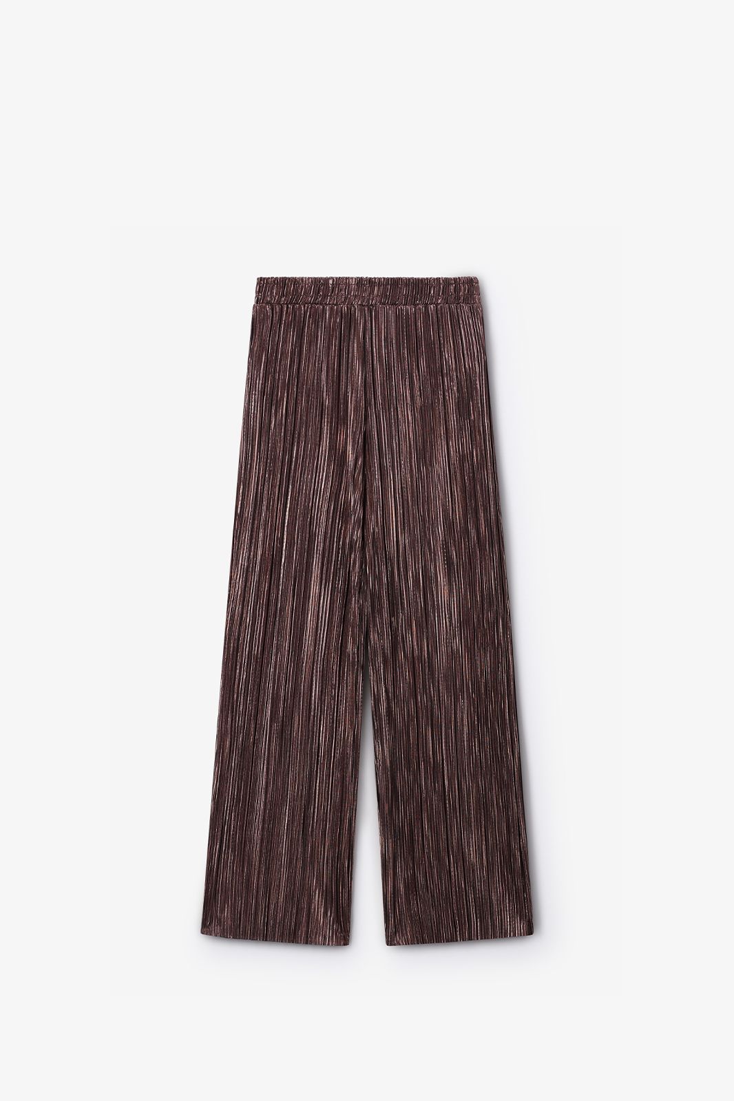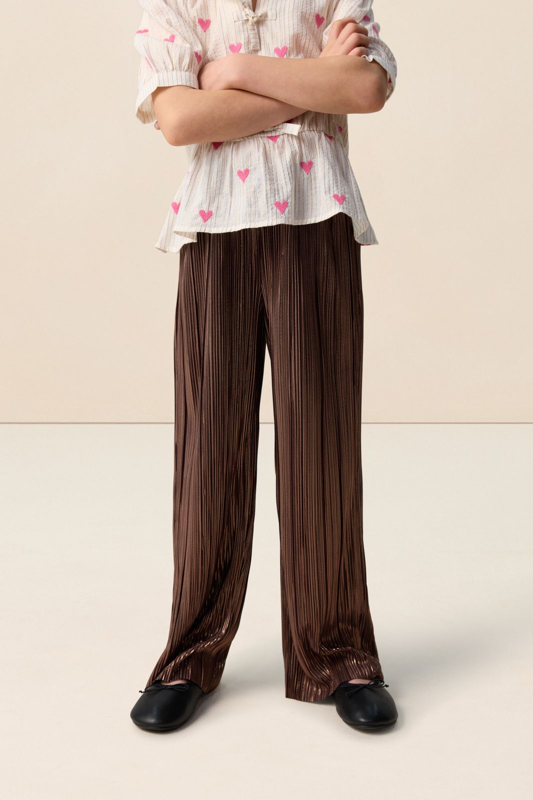 Gouden plissé broek van Sissy-Boy. De broek heeft een elastieken tailleband en loopt wijd uit. Verder is de broek gemaakt met een plissé kwaliteit stof met goudkleurige details. Materiaal: 100% polyester.