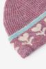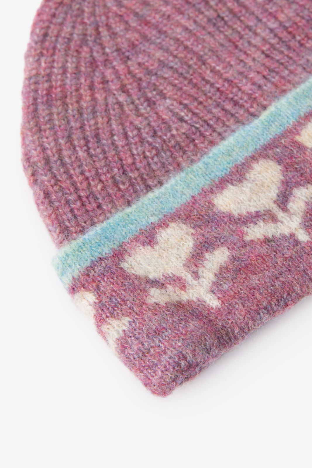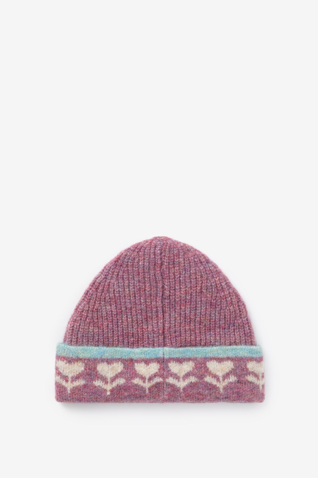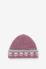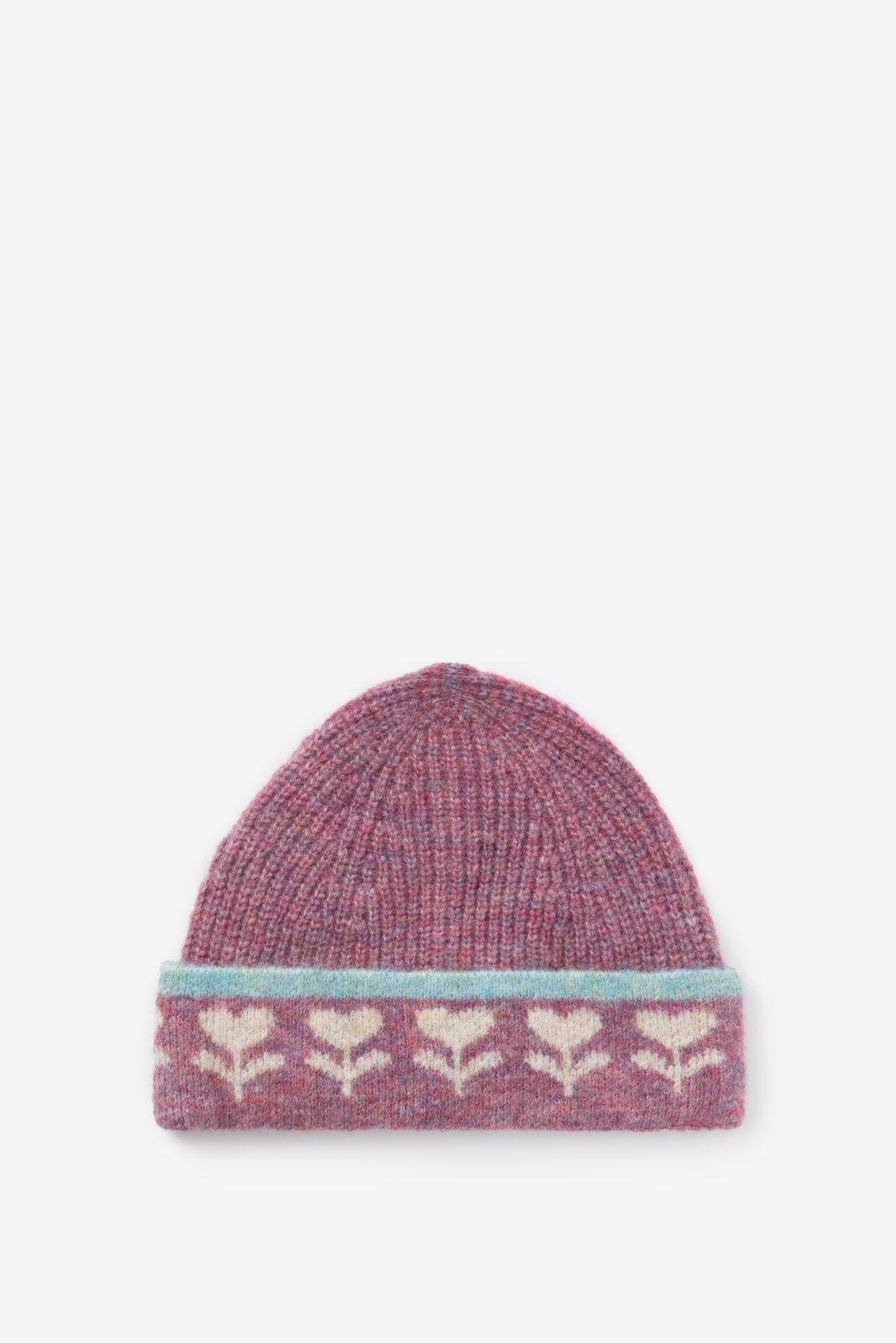 Paarse muts met hartjes van Sissy-Boy. De gebreide muts heeft een paarse kleur met hartjes en een blauwe streep. Materiaal: 28% polyester, 27% polyamide, 26% acryl, 10% wol, 6% mohair, 3% elastaan.