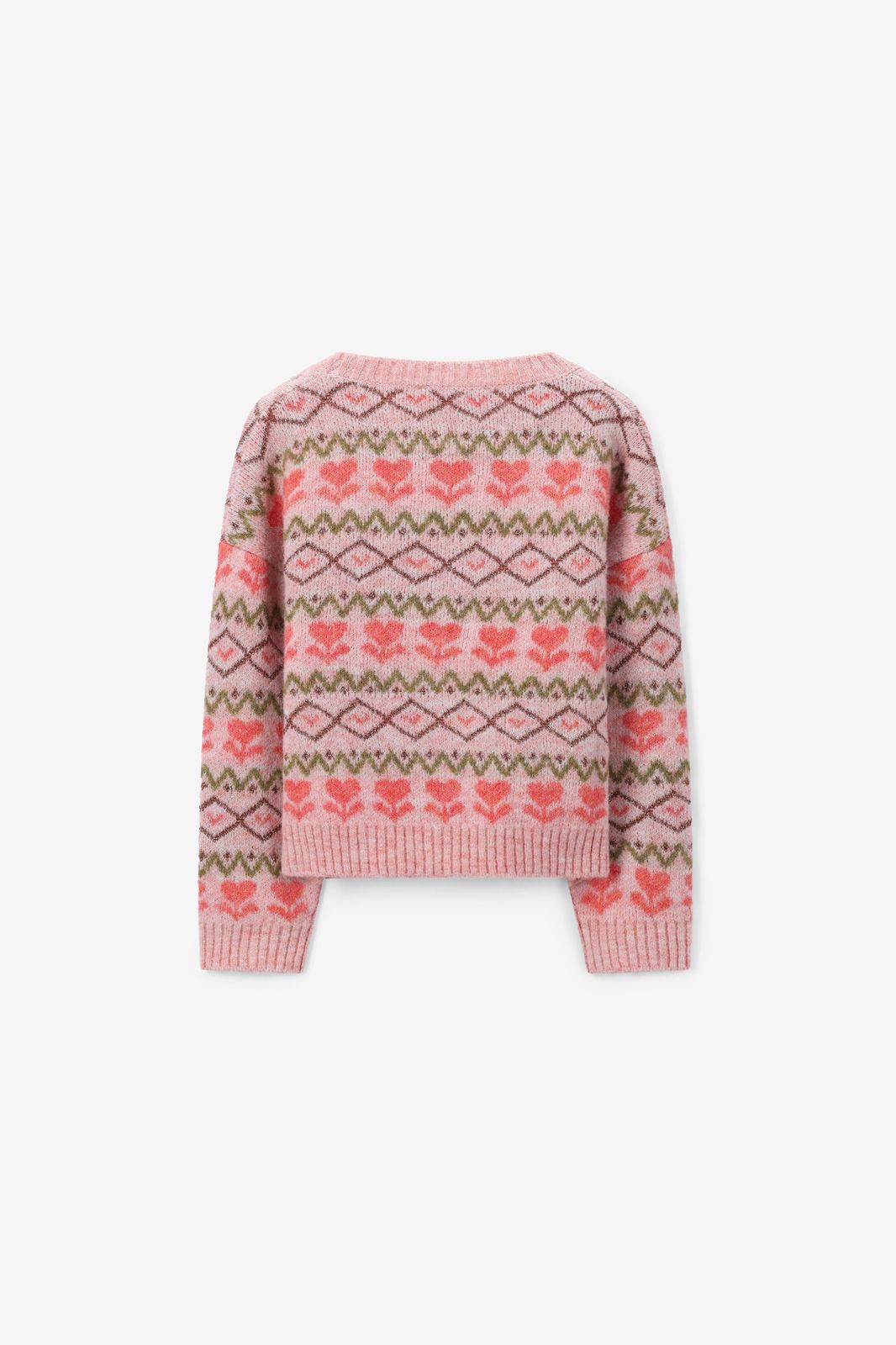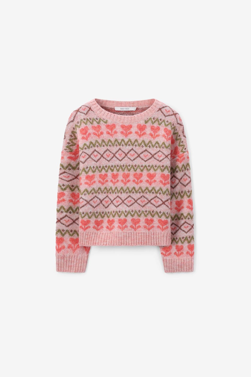 Roze jacquard trui met bloemenprint van Sissy-Boy. De trui heeft lange mouwen, een ronde halslijn, ribboorden en een relaxed fit. Daarnaast heeft het een all-over jacquard print met bloemen, zigzag details en lurexdraad in de stof vewerkt. Materiaal: 31% polyester, 25% polyamide, 23% acryl, 9% wol, 5% mohair, 4% metallic, 3% elastaan.
