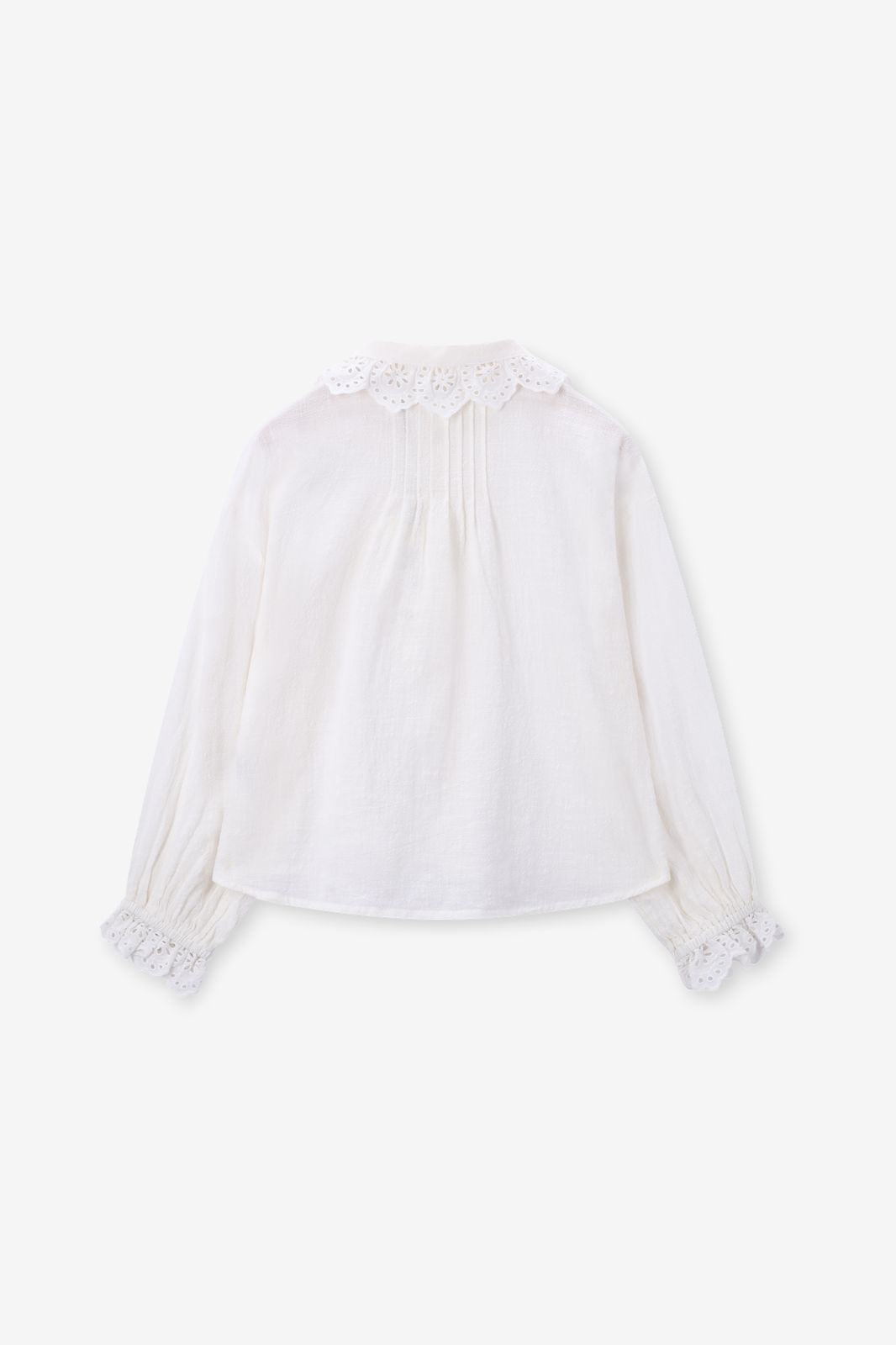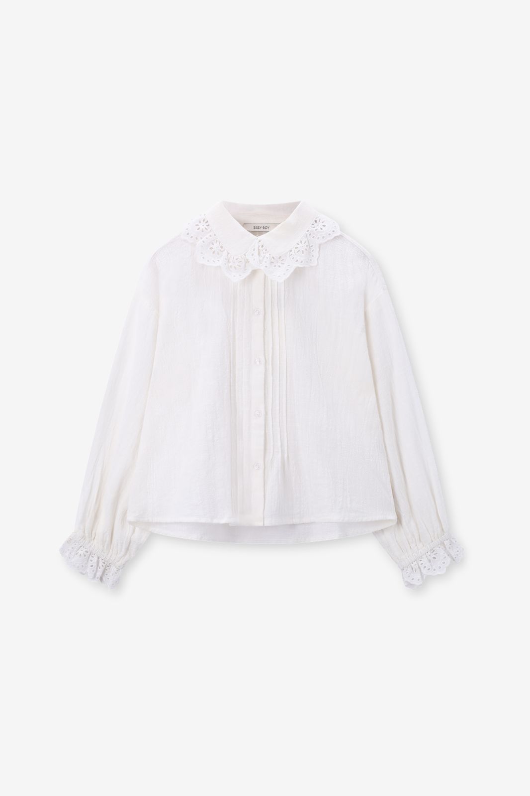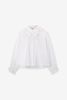 Witte blouse met kanten kraag van Sissy-Boy, De blouse heeft lange pofmouwen, knoopsluitingen, een kraag, verlaagde schouders en een relaxed fit. Verder heeft de blouse kanten details rond de kraag en mouwen. Materiaal: 100% katoen.