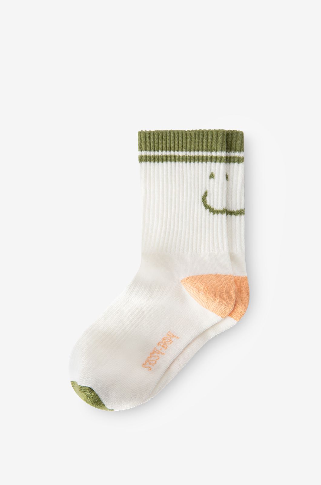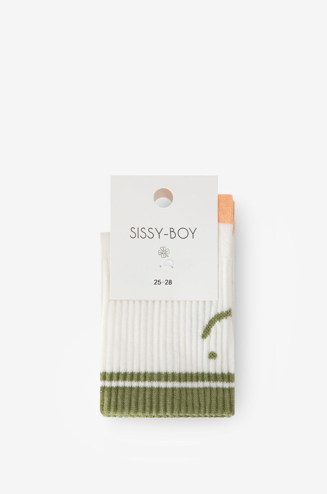 Witte sokken met smiley van Sissy-Boy. De sokken hebben 1 sportieve groene streep aan de bovenkant van de sok en een groene smiley aan de achterkant. Materiaal: 80% katoen, 18% polyamide, 2% elastaan.
